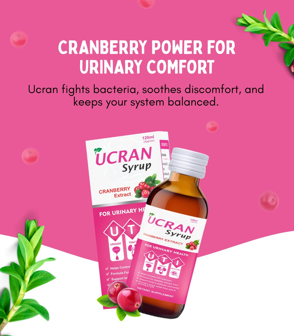 U-Cran Syrup contains standardized cranberry natural extract (PAC 36), ensuring every dose delivers clinically effective levels of active compounds. It’s also enriched with Vitamin C to strengthen immunity and support urinary health naturally.